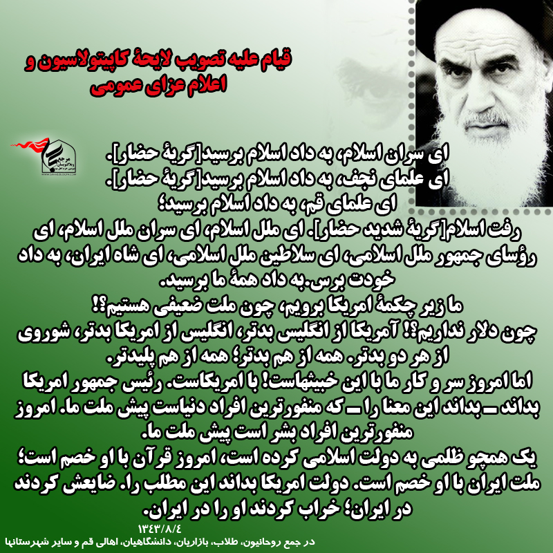 ![ای سران اسلام، به داد اسلام برسید[گریۀ حضار]. ای علمای نجف، به داد اسلام برسید[گریۀ حضار]. ای علمای قم، به داد اسلام برسید؛ رفت اسلام[گریۀ شدید حضار]. ای ملل اسلام، ای سران ملل اسلام، ای رؤسای جمهور ملل اسلامی، ای سلاطین ملل اسلامی، ای شاه ایران، به داد خودت برس. به داد همۀ ما برسید. ما زیر چکمۀ امریکا برویم، چون ملت ضعیفی هستیم؟! چون دلار نداریم؟! امریکا از انگلیس بدتر، انگلیس از امریکا بدتر، شوروی از هر دو بدتر. همه از هم بدتر؛ همه از هم پلیدتر. اما امروز سر و کار ما با این خبیثهاست! با امریکاست. رئیس جمهور امریکا بداند ـ بداند این معنا را ـ که منفورترین افراد دنیاست پیش ملت ما. امروز منفورترین افراد بشر است پیش ملت ما. یک همچو ظلمی به دولت اسلامی کرده است، امروز قرآن با او خصم است؛ ملت ایران با او خصم است. دولت امریکا بداند این مطلب را. ضایعش کردند در ایران؛ خراب کردند او را در ایران. ای سران اسلام، به داد اسلام برسید[گریۀ حضار]. ای علمای نجف، به داد اسلام برسید[گریۀ حضار]. ای علمای قم، به داد اسلام برسید؛ رفت اسلام[گریۀ شدید حضار]. ای ملل اسلام، ای سران ملل اسلام، ای رؤسای جمهور ملل اسلامی، ای سلاطین ملل اسلامی، ای شاه ایران، به داد خودت برس. به داد همۀ ما برسید. ما زیر چکمۀ امریکا برویم، چون ملت ضعیفی هستیم؟! چون دلار نداریم؟! امریکا از انگلیس بدتر، انگلیس از امریکا بدتر، شوروی از هر دو بدتر. همه از هم بدتر؛ همه از هم پلیدتر. اما امروز سر و کار ما با این خبیثهاست! با امریکاست. رئیس جمهور امریکا بداند ـ بداند این معنا را ـ که منفورترین افراد دنیاست پیش ملت ما. امروز منفورترین افراد بشر است پیش ملت ما. یک همچو ظلمی به دولت اسلامی کرده است، امروز قرآن با او خصم است؛ ملت ایران با او خصم است. دولت امریکا بداند این مطلب را. ضایعش کردند در ایران؛ خراب کردند او را در ایران.](http://s7.picofile.com/file/8233264034/60.jpg)